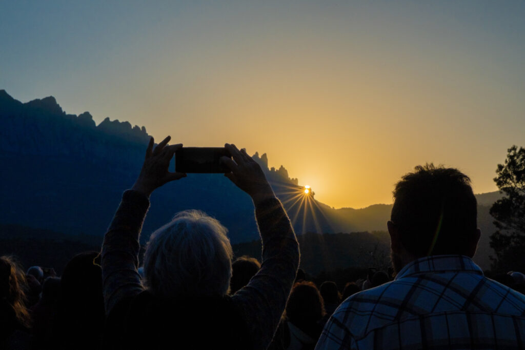 Centenars de persones han seguit aquest dilluns a la tarda des del Vilar la imponent posta de sol a través de la Roca Foradada de Montserrat